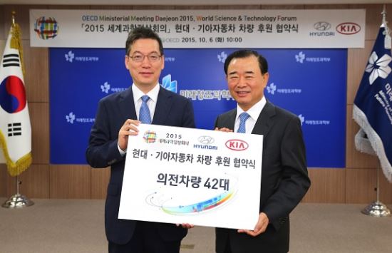 현대기아차는 6일 미래창조과학부 대회의실에서 현대기아차 박광식 부사장, 2015 세계과학정상회의 준비기획단 최영해 단장 등 관계자들이 참석한 가운데 차량 후원 협약식을 가졌다.