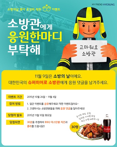 효성은 국민의 안전과 편의를 위해 위험을 무릅쓰는‘국민안전지킴이’ 소방관들에게 따뜻한 사랑과 응원의 메시지를 달아주는 소셜팬 30명을 추첨해 치킨 세트를 경품으로 증정할 예정이다.