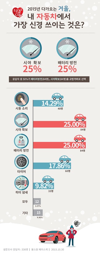 자동차용품 전문기업 불스원이 자사의 공식 페이스북을 통해 운전자들을 대상으로 설문조사를 진행한 결과, 이번 겨울 운전자들은 주행 중 시야확보(25%)와 배터리 방전(25%)을 가장 크게 걱정하는 것으로 나타났다.