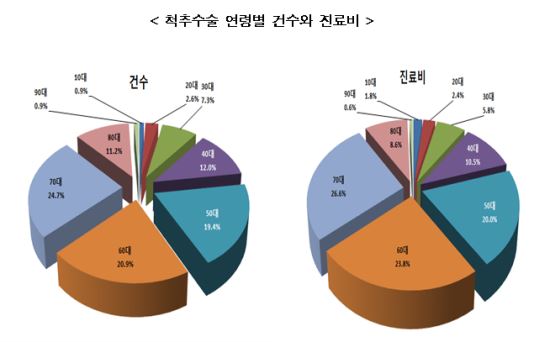 연령별 척추수술 현황은 2014년 기준 70대가 24.7%(3만8000건)로 가장 많았고 진료비도 26.6%(1230억원)로 가장 높게 집계됐다. 특히 90대 이상의 노년층에서는 수술건수가 1435건(0.9%)으로 2007년 이후로 서서히 늘어나고 있는 추세다. 이와 관련 80대 이상을 제외한 전 연령층에서 2013년과 비교해 수술건수 및 진료비가 감소하는 추세인데, 반면 80대와 90대는 증가세를 보이는 것으로 나타났다.