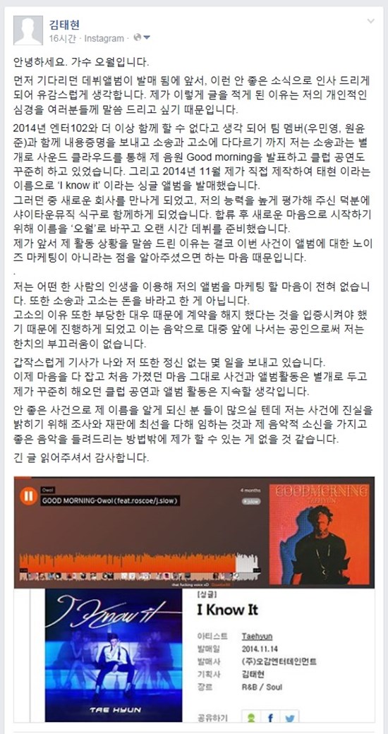 오월은 9일 자신의 SNS “결코 이번 사건이 앨범에 대한 노이즈 마케팅이 아니라는 점을 알아주셨으면 하는 마음 때문”이라며 앞서 사운드 클라우드로 음악 활동을 지속해왔다는 점과 태현이라는 이름으로 지난해 11월 ‘I know it’이라는 싱글 앨범을 발매했다고 강조했다.