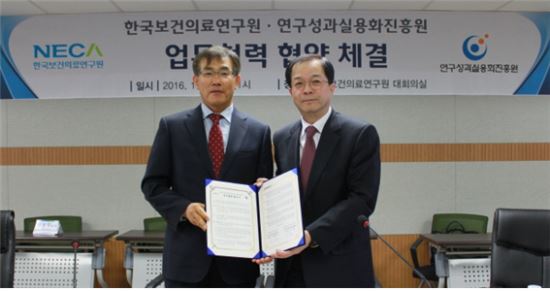 [쿠키뉴스=박예슬 기자] 한국보건의료연구원(이하 NECA)과 연구성과실용화진흥원은 지난 13일 오전 11시 한국보건의료연구원에서 국내 유망의료기술 개발 지원을 위한 업무협력 협약을 체결했다.