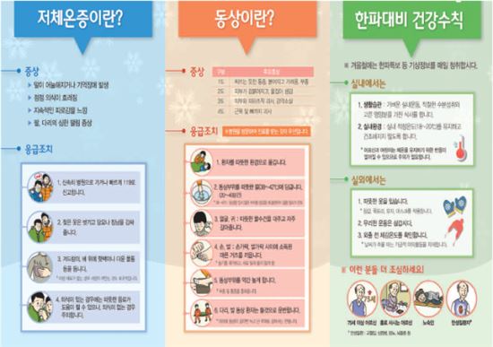 한편 질본은 한랭질환 응급조치, 한파대비 건강수칙 등 포스터와 리플릿 등 홍보자료를 제작해 배포했다고 밝혔다. 홍보자료는 질병관리본부 홈페이지(www.cdc.go.kr)에서 확인 가능하다. yes228@kukimedia.co.kr