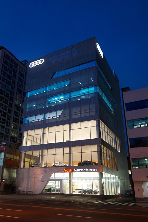 부산 수영구 남천동 광안대교 진입로에 위치한 남천 전시장은 1181m²의 대지면적, 5543 m²의 연면적에 지하 1층 지상 7층의 건물로 신축됐다. 전체 총 28대의 차량을 동시 전시 가능하며 1층과 2층에는 16대의 신차, 그리고 3층에는 아우디 공식 인증 중고차 12대가 전시 된다.