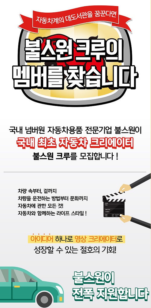 [쿠키뉴스=이훈 기자] 자동차용품 전문기업 ㈜불스원은 자동차를 사랑하는 문화를 알리기 위한 ‘자동차 영상 크리에이터, 불스원 크루’ 선발 공모전을 개최한다.