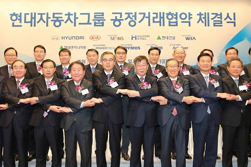 현대차그룹은 이 기세를 몰아가기 위해 10일 경기 화성 롤링힐즈 2380개 협력사와 ‘2016 공정거래협약’ 체결식을 가졌다.