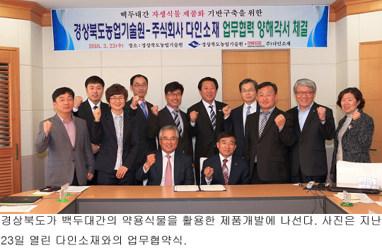 이를 위해 경북도 농업기술원은 지난 21일과 23일 각각 항균 소재 기업인 ㈜다인소재, 교촌치킨 자회사인 ㈜BHN 바이오와 ‘백두대간 약용자원식물 산업화’ 업무협약을 했다.