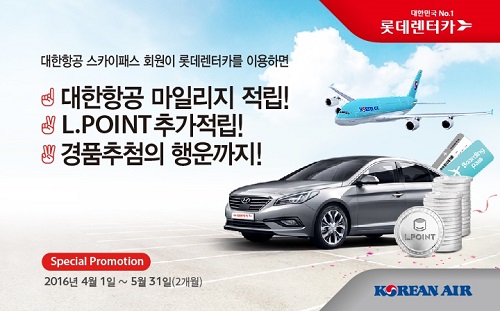 "[쿠키뉴스=이훈 기자] 롯데렌탈 렌터카 브랜드 롯데렌터카(구 kt금호렌터카)는 대한항공과 마일리지 적립 제휴를 기념해 5월말까지 다양한 공동 프로모션을 진행한다.