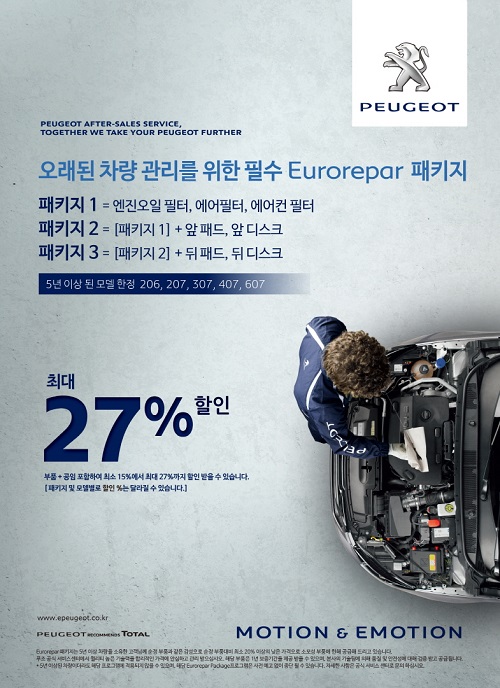 ‘유로레파 패키지’ 부품은 PSA 그룹 본사 기술팀에 의해 엄격하고 세밀한 품질, 안정성 검증을 거쳐 관리되는 대체 부품으로 순정 부품과 유사한 수준의 품질 및 성능을 갖추고 있다. 순정 부품 대비 20~30% 낮은 가격으로 서비스를 제공해 소비자들이 가격 부담 없이 믿고 사용할 수 있다는 것이 특징이며 차량 마일리지에 관계없이 부품에 대한 1년 보증을 제공받게 된다.