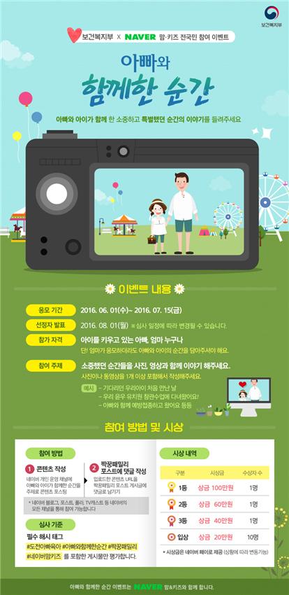 [쿠키뉴스=박예슬 기자] 보건복지부는 아빠의 육아참여 분위기를 전사회적으로 확산하고자 네이버 맘·키즈와 함께 ‘아빠와 함께한 순간’ 이벤트를 실시한다.