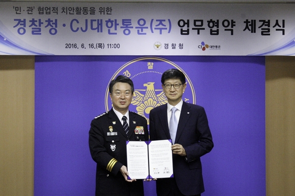 CJ대한통운은 16일 경찰청에서 박근태 CJ대한통운 대표이사와 강신명 경찰청장이 참석한 가운데 ‘민관 협업적 치안활동을 위한 업무협약’을 체결했다.