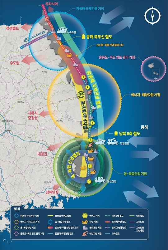 미래 에너지·해양자원 신성장 동력 창출, 신산업 창출 및 특화산업 기반 구현, 환동해 국제관광 기반 및 융·복합 관광 육성, 환동해 소통 인프라 확충 등이 추진될 예정이다.