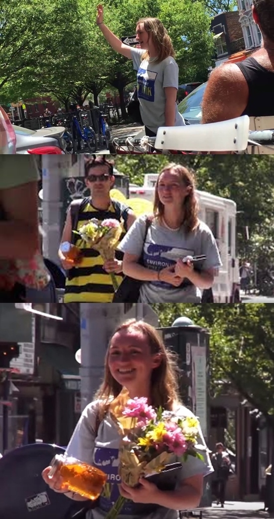 이때 꿀벌 복장의 남성이 나타나 꽃다발을 건네며 감사 인사를 합니다.