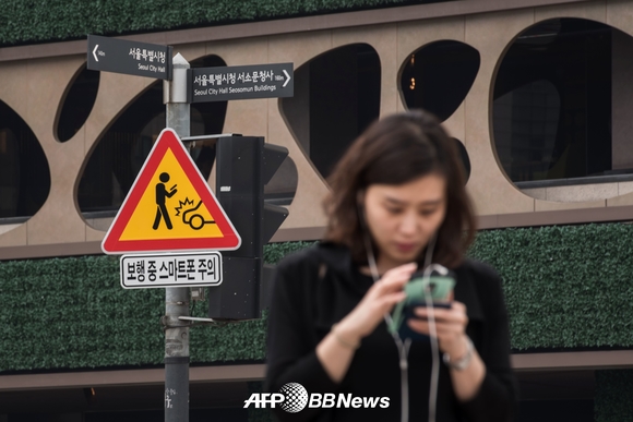 서울시와 경찰청은 길을 걸으면서 스마트폰을 사용하는 것이 위험하다고 알리는 교통안전표지판 및 보도부착물을 설치했다.