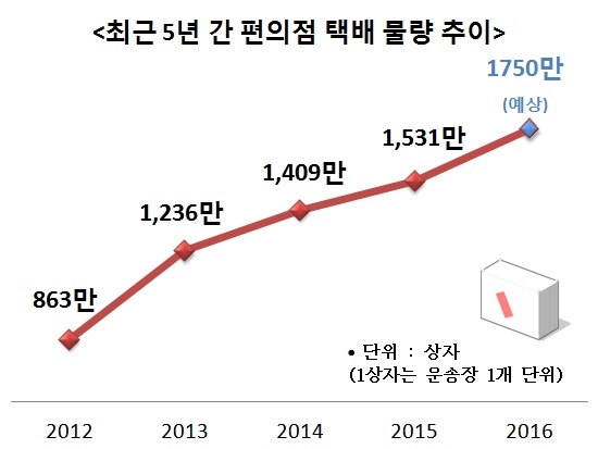 CJ통운 관계자는 “지속적인 성장세에 따라 올해 편의점 택배 연간 물량이 1750만 상자를 돌파할 수 있을 것”이라고 예상했다.