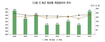 3일 한국고용정보원이 밝힌 ‘청년층 취업준비자 현황과 특성’ 보고서에 따르면 지난 2014년 41만명을 기록했던 청년층 취업준비생은 지난해 54만2천명으로 급증했다. 이는 2008년 금융위기 때와 비슷한 수준이다.