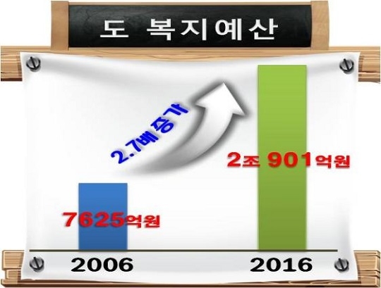 도의 복지 예산이 2006년 7625억원에서 2016년 2조 901억원으로 10년 새 2.7배 증가한 것만 봐도 알 수 있다. 전체 예산의 26.2%를 차지한다.