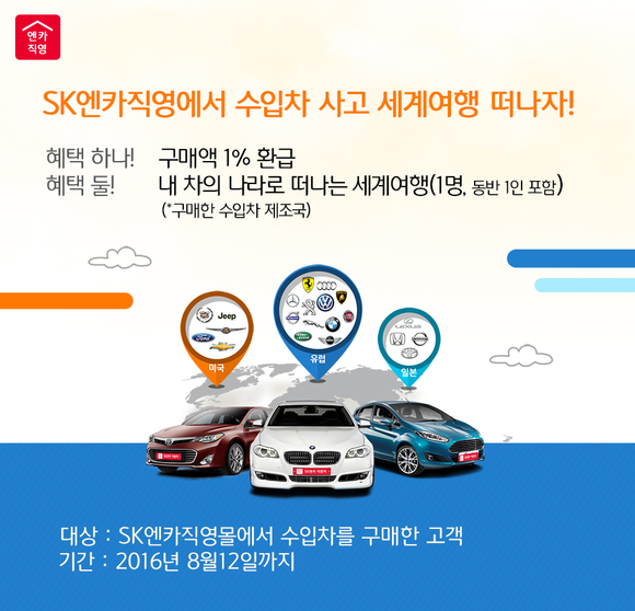 중고차 매매 전문기업 SK엔카직영은 SK엔카직영몰에서 수입차를 구매하는 소비자를 대상으로 차 구매액의 1%를 돌려주고 수입차 제조국으로 여행도 보내주는 이벤트를 8월 12일까지 실시한다.