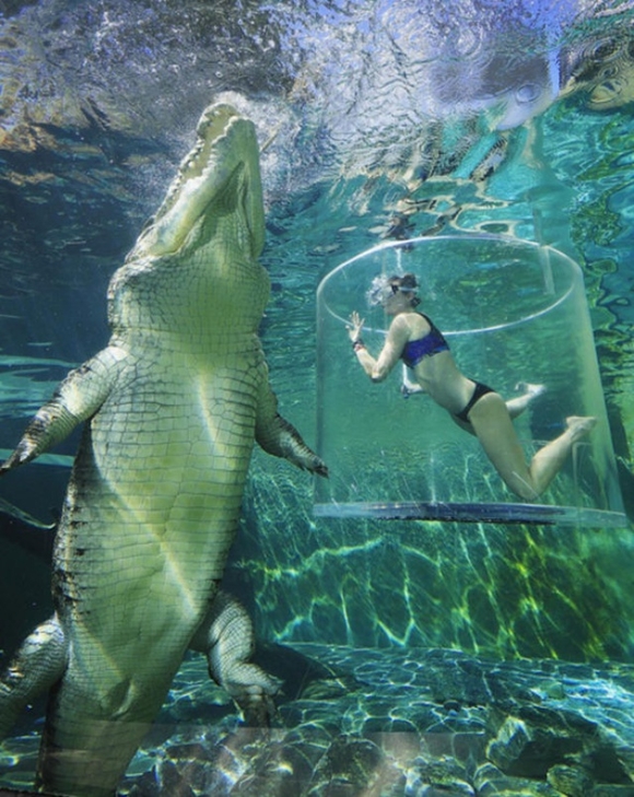 거대한 악어가 헤엄쳐 다니는 물속을 체험하는 겁니다.