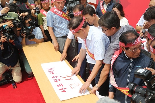 김항곤 성주군수가 13일 경북 성주군 성주읍 성밖숲에서 열린 사드배치 반대 군민 궐기대회에서 혈서를 쓰고 있다.