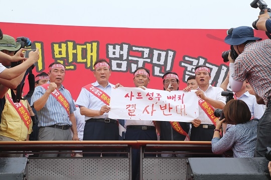 김항곤 성주군수가 13일 경북 성주군 성주읍 성밖숲에서 열린 사드배치 반대 군민 궐기대회에서 혈서를 쓴 뒤 들어 보이고 있다.