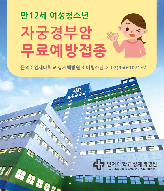 인제대학교 상계백병원은 오는 18일 월요일부터 국가필수예방접종(NIP)으로 포함된 자궁경부암 무료 예방접종을 실시한다.