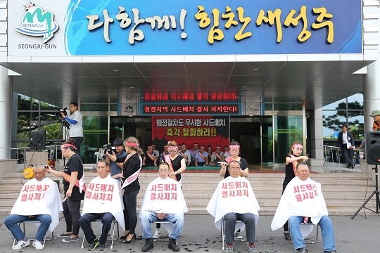 14일 오후 경북 성주군청 앞에서 열린 ‘사대배치 반대 삭발식’에서 주민대표들이 삭발하며 반대 의지를 다지고 있다.