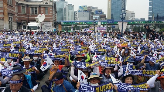 21일 오후 서울역 광장에서 성주 군민 2000여 명이 사드(THAAD.고고도미사일방어체계) 배치 철회 집회를 하고 있다.