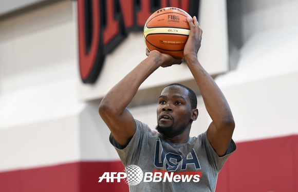 미국 농구 남자 국가 대표팀 케빈 듀란트가 20일(현지시간) 연습에서 슛 자세를 취하고 있다.