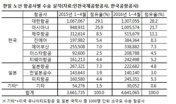 한일노선 전체 이용객수는 464만1000여명으로 이 가운데 대한항공과 제주항공 등 7개 우리 국적사를 이용한 여객은 400만2840명으로 전체 이용자의 86.2%를 차지했다.