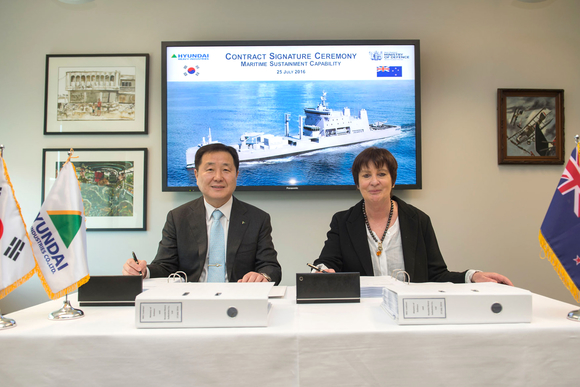 현대중공업은 25일 뉴질랜드 웰링턴에서 뉴질랜드 해군과 배수량 2만3000톤급의 군수지원함 1척에 대한 건조 계약을 체결했다.