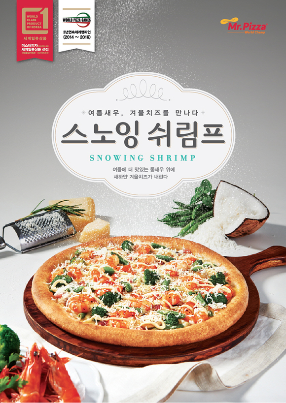 관련업계에 따르면 미스터피자는 코코넛의 고소함과 아삭한 식감을 느낄 수 있는 코코넛슈레드를 가득 올린 여름 신제품 ‘스노잉쉬림프’를 출시했다.