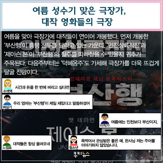 여름을 맞아 극장가에 대작들이 연이어 개봉했다. 먼저 개봉한 ‘부산행’이 흥행 선두를 달리고 있는 가운데, ‘인천상륙작전’과 ‘제이슨 본’이 ‘부산행’의 질주를 따라잡을 수 있을지 귀추가 주목된다. 다음주부터는 ‘덕혜옹주’도 가세해 극장가를 더욱 뜨겁게 달굴 전망이다.