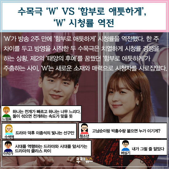 ‘W’가 방송 2주 만에 ‘함부로 애틋하게’ 시청률을 역전했다. 한 주 차이를 두고 방영을 시작한 두 수목극은 치열하게 시청률 경쟁을 하는 상황. 제2의 ‘태양의 후예’를 꿈꿨던 ‘함부로 애틋하게’가 주춤하는 사이, ‘W’는 새로운 소재와 매력으로 시청자를 사로잡았다.