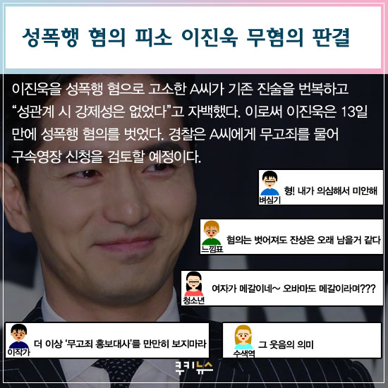 이진욱을 성폭행 혐으로 고소한 A씨가 기존 진술을 번복하고 “성관계 시 강제성은 없었다”고 자백했다. 이로써 이진욱은 13일 만에 성폭행 혐의를 벗었다. 경찰은 A씨에게 무고죄를 물어 구속영장 신청을 검토할 예정이다.
