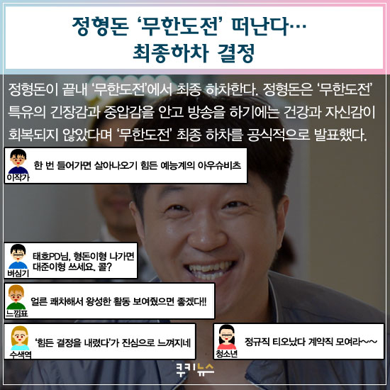정형돈이 끝내 ‘무한도전’에서 최종 하차한다. 정형돈은 ‘무한도전’ 특유의 긴장감과 중압감을 안고 방송을 하기에는 건강과 자신감이 회복되지 않았다며 ‘무한도전’ 최종 하차를 공식적으로 발표했다.