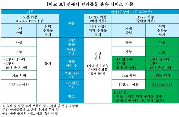진에어가 국내 LCC 중 유일하게 운영 중인 중대형 항공기 B777-200ER 기종에 한해 차별화된 서비스를 신설 및 변경하는 것으로 기존 대비 허용 마리 수와 무게 및 크기도 확대된다.