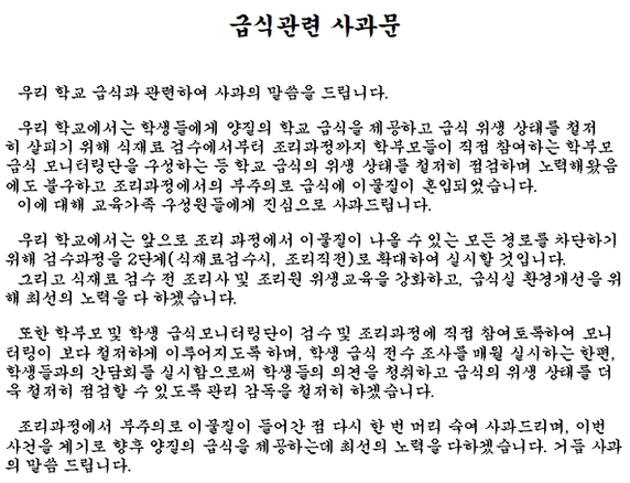 학교는 “학교 급식의 위생 상태를 철저히 점검해왔지만 조리 과정상의 부주의로 이물질이 급식에 들어갔다. 진심으로 사과드린다”고 사과문을 게재했다.