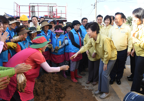 [쿠키뉴스 경주=김희정 기자] 20일 경북 경주지역의 지진 피해현장을 방문한 박근혜 대통령이 복구현장의 자원봉사자들과 주민들에게 손을 내밀며 격려하고 있다.
