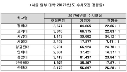 [쿠키뉴스=김성일 기자] 21일 2017학년도 수시 원서접수가 모두 마감됐다. 올해 수시 경쟁률은 전체적으로 하락세를 보인 가운데 의대를 중심으로 한 주요 인기학과의 경쟁률이 높게 나타났다. 서울 주요 일부 대학을 중심으로 수시 접수 마감 현황을 살펴본다.