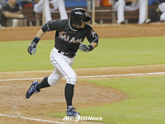 [쿠키뉴스=이훈 기자] 마이애미 말린스 이치로 스즈키가 애틀란타 브레이브스와의 경기에서 타격 후 1루로 달려가고 있다.