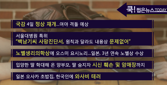 [쿠키뉴스=이승희 기자] 새누리당의 복귀로 20대 국회 국정감사가 정상화된다. 서울대병원 특별위원회(특위)는 긴급 기자회견을 통해 고(故) 백남기(69)씨의 사망 진단서에 문제가 없음을 밝혔다. 올해 첫 노벨상 수상은 일본의 생물학자 오스미 요시노리(大隅良典·71·사진) 도쿄공업대 명예교수에게 돌아갔다. 한편 양부모가 숨진 딸의 시신을 훼손하고 암매장한 사실과 일본 오사카의 한 초밥집에서 한국인을 상대로 ‘와사비 테러’를 벌인 일이 드러나 논란이 일고 있다.