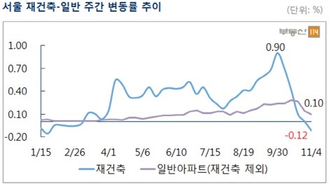 4일 부동산114에 따르면 11월 첫째 주(10월 31일~11월 4일) 서울 아파트 가격은 전주보다 0.06% 상승했다. 재건축 아파트 매매가는 지난주 0.00% 상승률을 기록한 데 이어 이번 주 0.12% 하락했고 일반 아파트도 전주 대비 0.10% 오르며 상승폭이 줄어들었다.