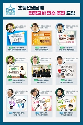 이번에 티처빌이 추천하는 초등 연수로는 난우초등학교 허승환 교사의 ‘허쌤의 참여수업을 위한 교실놀이’, 면중초등학교 전병규 교사의 ‘질문과 대화의 학생중심 수업, 학습대화’, 군포 양정초등학교 이영근 교사의 ‘참·사랑·땀으로 자라는 아이들-초등학급경영’ 등이 포함됐다.