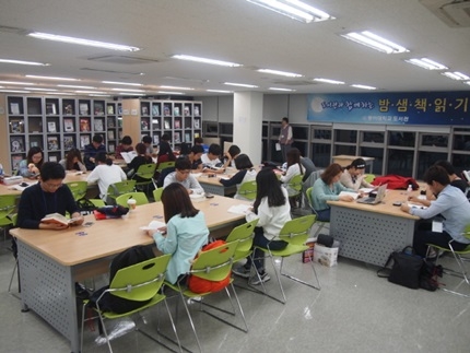 올해로 3회째를 맞는 밤샘 책읽기 행사에서 참가자들은 5인 1조 14개 팀으로 나눠 배정된 스터디룸에서 독서를 즐긴다.