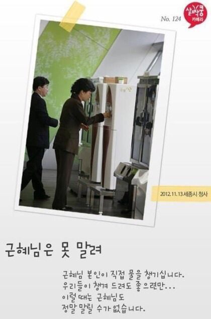 ‘근혜님은 못 말려’라는 제목의 해당 사진에는 “근혜님 본인이 직접 물을 챙기십니다. 우리들이 챙겨드려도 좋으련만. 이럴 때는 근혜님도 정말 말릴 수가 없습니다”라는 글귀가 적혀있다.