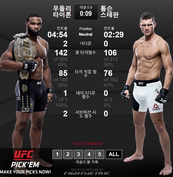 13일 미국 뉴욕 메디슨 스퀘어 가든에서 열린 UF 205 웰터급 타이틀매치에서 미국의 타이론 우들리는 랭킹 2위 스테판 톰슨과의 경기에서 무승부를 기록했다. 챔피언결정정인 만큼 타이론 우들리는 무승부만으로 왕좌를 지키게 됐다.