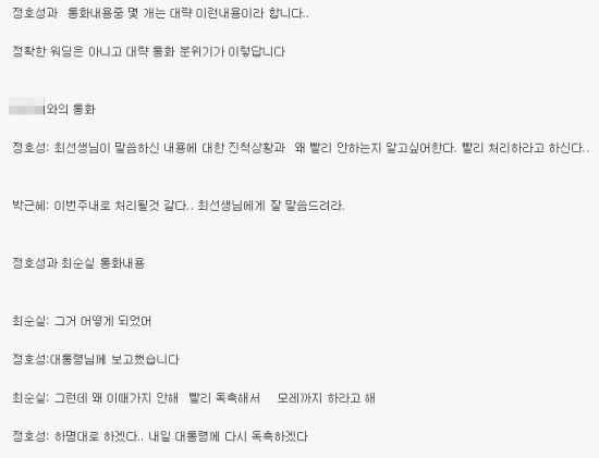 정 전 비서관과 최씨의 통화내용으로 보이는 글도 있었다.