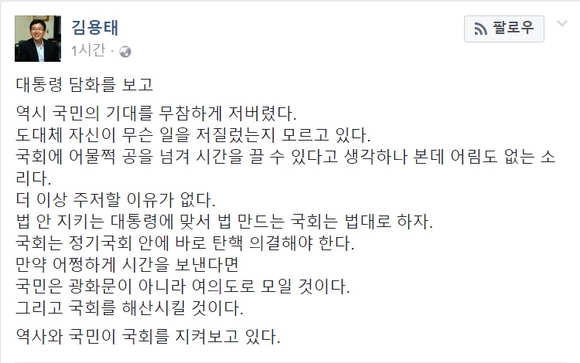 새누리당을 탈당한 김 의원은 “(박 대통령은) 역시 국민의 기대를 무참하게 저버렸다”며 “자신이 무슨 일을 저질렀는지 모르고 있다”고 글을 남겼다.