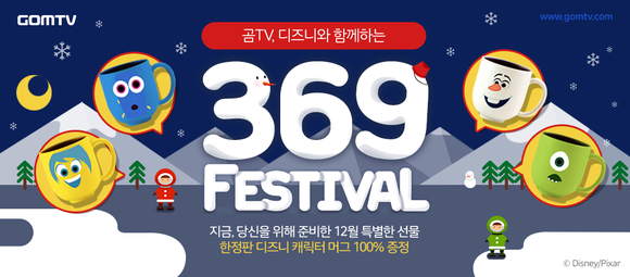 ‘369 페스티벌’은 디즈니 또는 픽사의 애니메이션 중 3편 이상을 다운로드 구매한 고객 전원에게 한정판 디즈니 캐릭터 머그컵을 증정하는 프로모션이다. 디즈니 애니메이션 ‘몬스터주식회사’의 외눈 괴물 마이크, ‘겨울왕국’의 눈사람 울라프, ‘인사이드 아웃’의 조이, ‘도리를 찾아서’의 도리 등 각각 캐릭터가 표현된 이벤트 한정 품목을 증정한다.